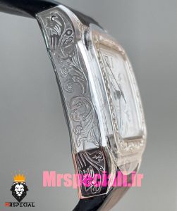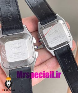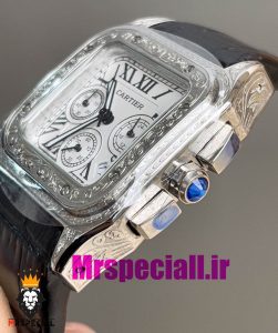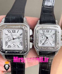 معرفی ساعت ست کارتیه زنانه و مردانه مدل سانتوس کرنوگراف بند چرم مشکی قاب استیل حکاکی صفحه سفید 020976 Cartier Santos100