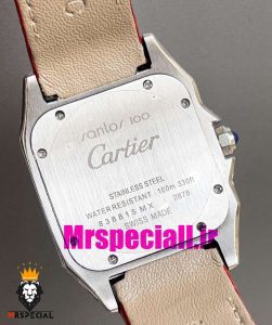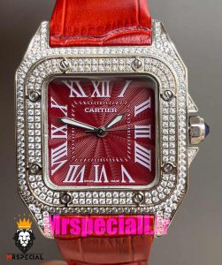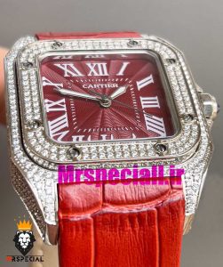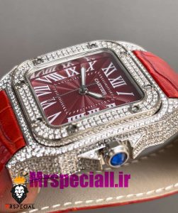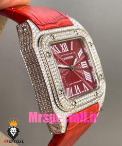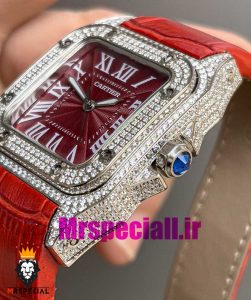 معرفی ساعت کارتیه زنانه مدل سانتوس فول نگین باتری بند چرم قرمز صفحه قرمز 020970 Cartier Santos100