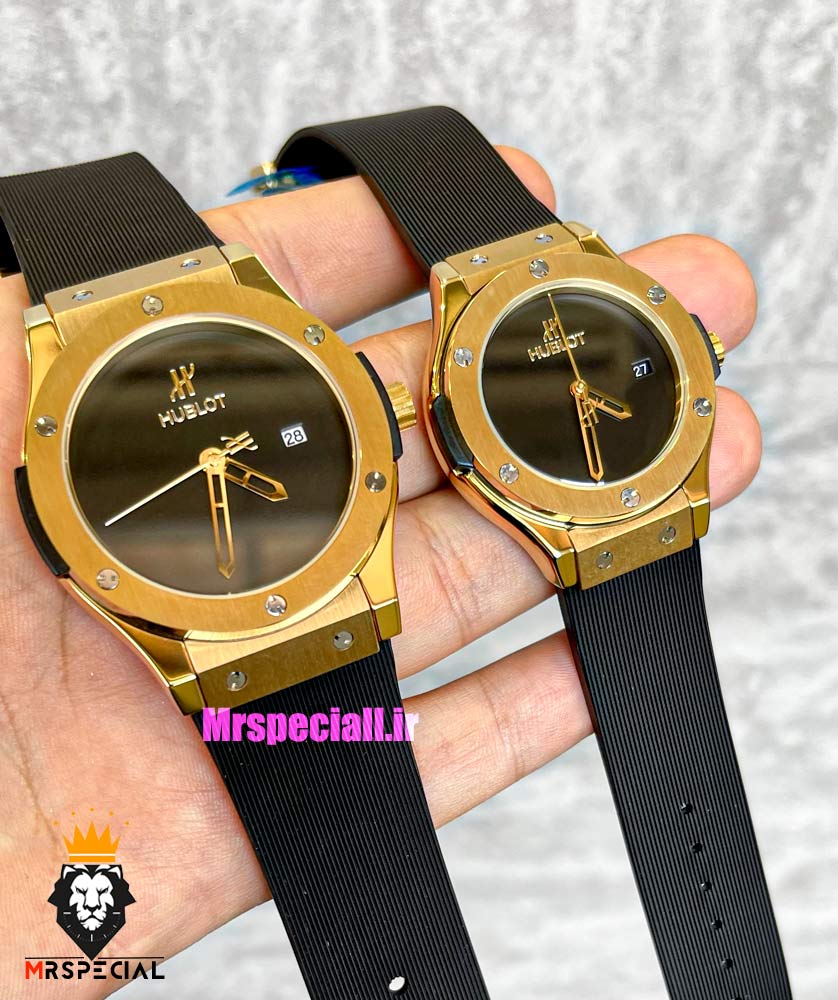 معرفی ساعت ست هابلوت مردانه و زنانه کوارتز قاب طلایی بند رابر مشکی صفحه مشکی 021350 HUBLOT BIG BANG