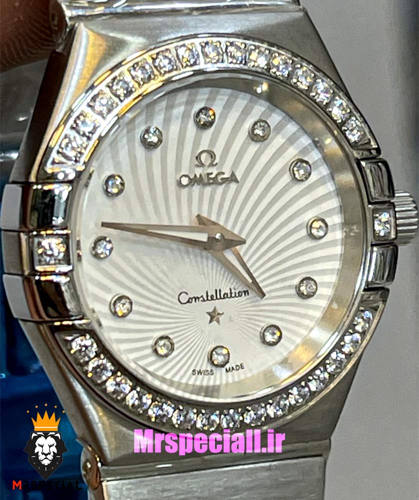 • ساعت زنانه امگا کانسلیشن از جذاب ترین مدل های خانواده‌ی مشهور امگا با بیشترین طرفدار در دنیا می‌باشد.موتور این ساعت تک زمانه سوئیسی ساخت سوئیس می‌باشد .جنس بند نیز استینلس استیل ضد حساسیت و ضد زنگ بوده ،جنس شیشه و قاب این ساعت به ترتیب از سافایر ضد خش و استینلس استیل ضد حساسیت و ضد زنگ می‌باشد .اعداد نگین رنگ ساعت استیل با صفحه سفید میباشد .