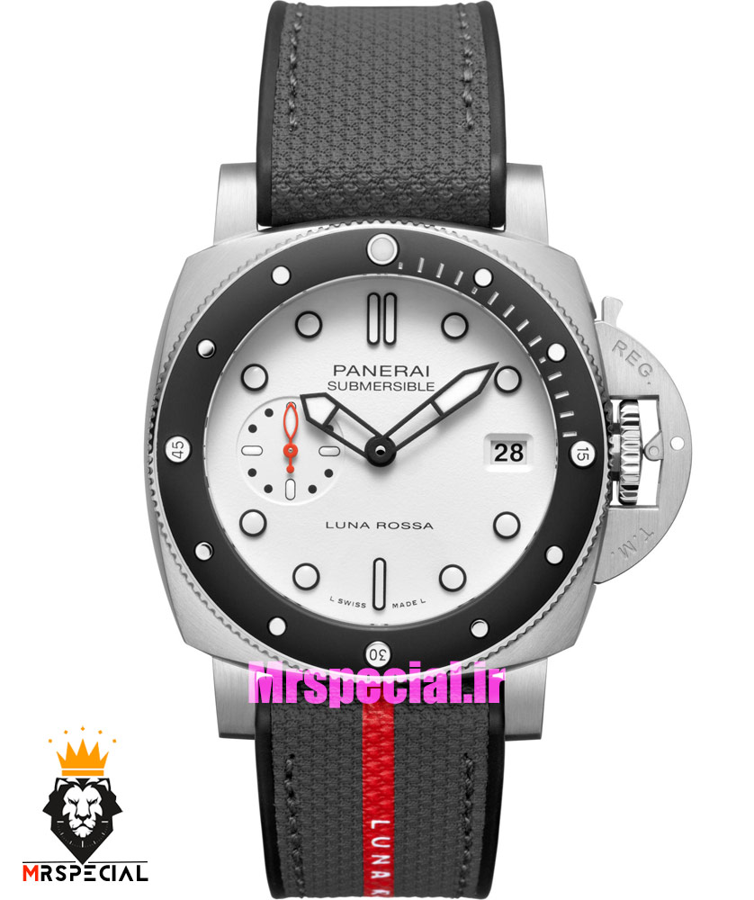 معرفی ساعت مردانه پنرای اتوماتیک بند رابر مشکی قرمز صفحه سفید 021404 Panerai Luminor Submersible