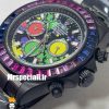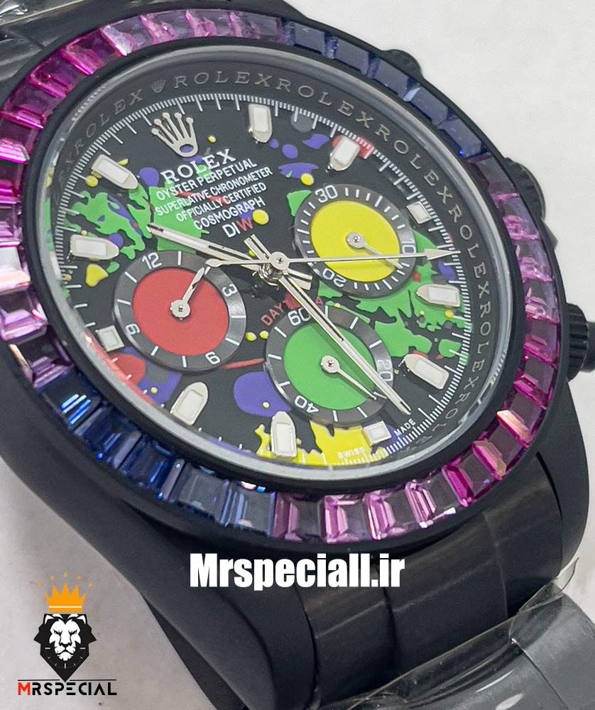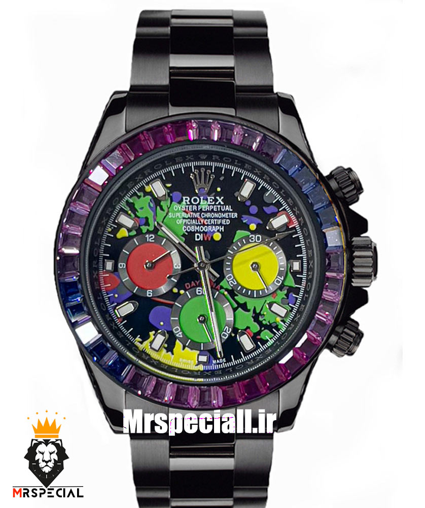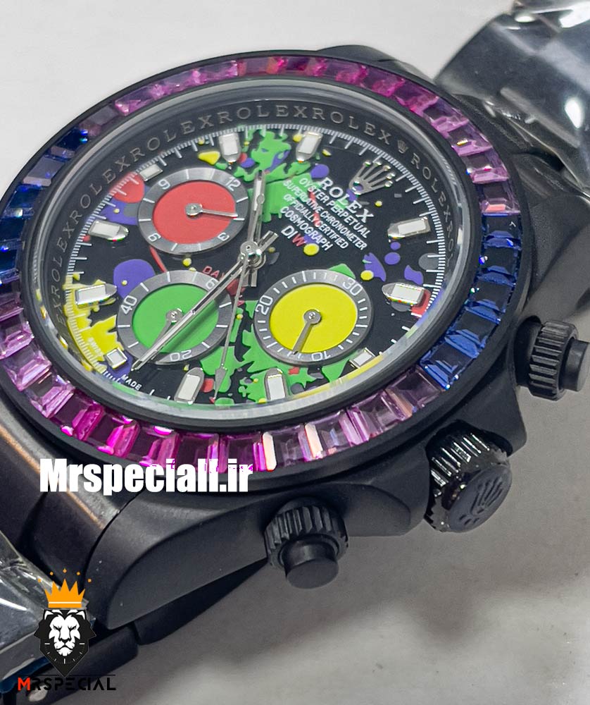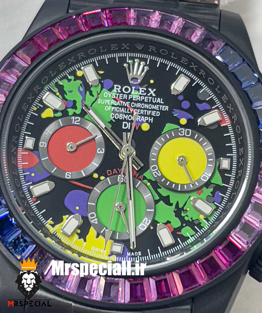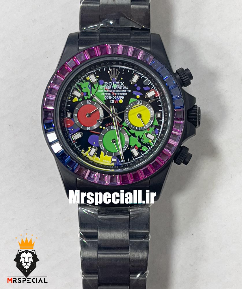 معرفی ساعت رولکس مردانه مدل دیتونا مشکی اتوماتیک نگین باگت بنفش صفحه خاص 021308 ROLEX DAYTONA Replica