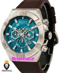 ساعت الکسا مردانه اورجینال کرنوگراف بند چرم قهوه ای قاب استیل صفحه کله غازی 021090 ALEXA Professional